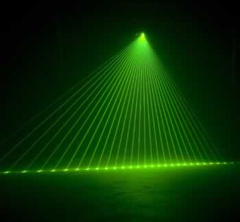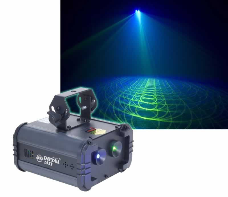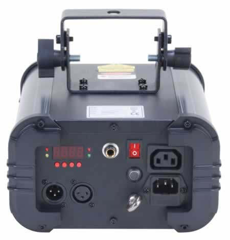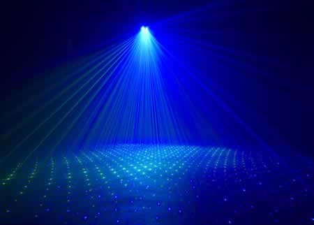 Laser projector that creates blue and green patterns that rotate back and forth. 30mW Green and 350mW Violet-Blue. Master/slave, DMX and sound activation modes available.