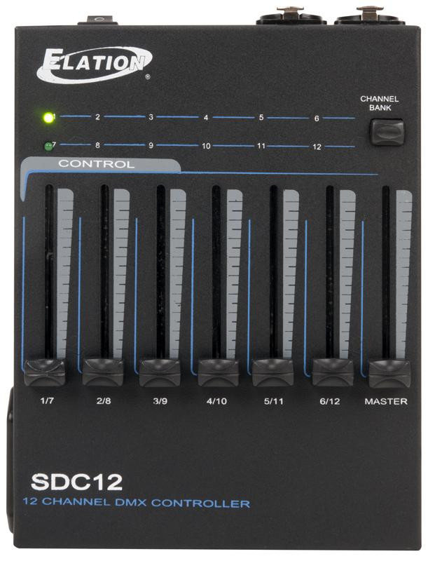 The SDC12 features 12 DMX channels, DIP switches to set a starting DMX channel, a master dimmer fader, on/off switch, 3-pin and 5-pin XLR output, and operates via an external 12VDC power supply (included) or a 9VDC battery (not included).