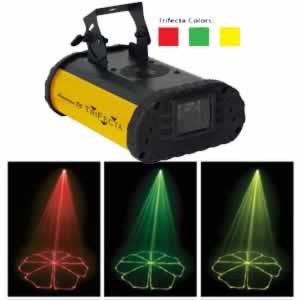 Includes built-in patterns, with three channels of DMX control and your choice of three operating modes, the possibilities are endless! 4.9mW Laser shoots out Red, Green and Yellow Beams.