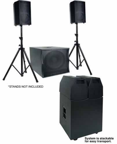 System includes two 8" 2-way satellite speakers and one powered 15" Subwoofer with built-in 3-channel amplifier.
