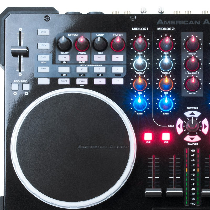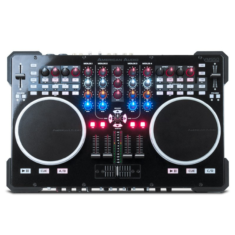 The American Audio VMS5 is one of the most comprehensive DJ Controller ever designed for performance minded DJs looking for a solid, all-in-one Midi Controller to control their software and music from their laptop (4 Deck and 2 Deck DVS!), plus have option to use the stand alone mixer as a tradition analog mixer with 4 line inputs, 2 Phono inputs and 2 Microphone inputs. In addition, some general features include 4 USB / Analog selectable Midilog (Midi & Analog) channels, gain/treble/mid/bass EQ on all MIDILOG channels.