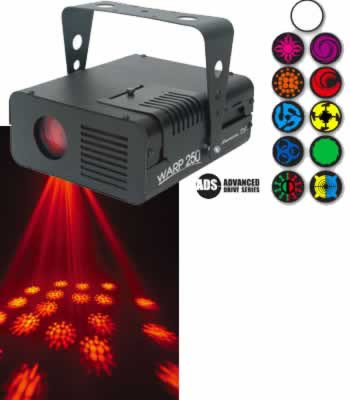 The Warp 250 is a 250 watt moonflower effect that rotates back and forth to the beat of the music. Displays a fantastic selection of 11 gobos each presented with vivid colors.
