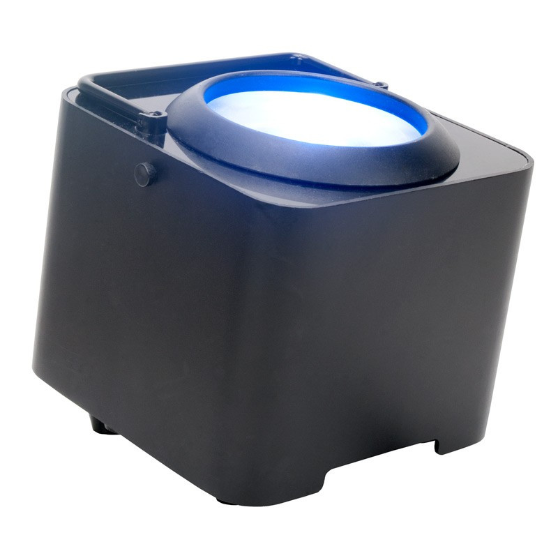 It may be used as a 20-degree Par or as a 66-degree wide wash with the lens removed. There are 32 built-in color macros, 5 DMX channel modes and 7 operational modes to choose from. The IEC In/Out power connectors, DMX IN/Out connectors and wireless DMX antenna are tucked away underneath the unit. There are rubber feet so the fixture may be set on the ground. There is also a built-in kickstand to angle the par while its on the floor.