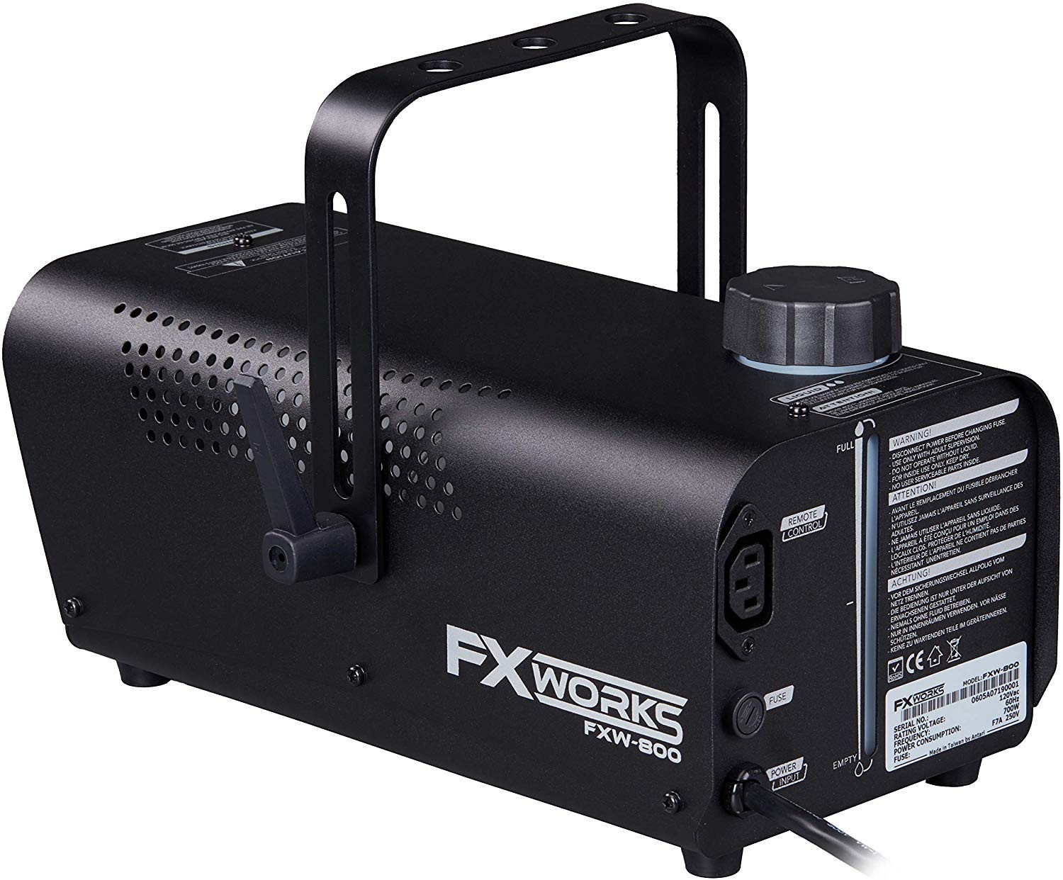 The FXW-800 is a compact 800 watt mobile fog machine that has been specifically designed for small nightclubs and bars, mobile entertainers and DJs, and anyone else that wants to add a dry and consistent smokey atmosphere to their event. Unit includes a built-in reservoir, hanging bracket, and wired remote. This unit has been designed to reliably outperform any unit in its class due to its use of superior components.