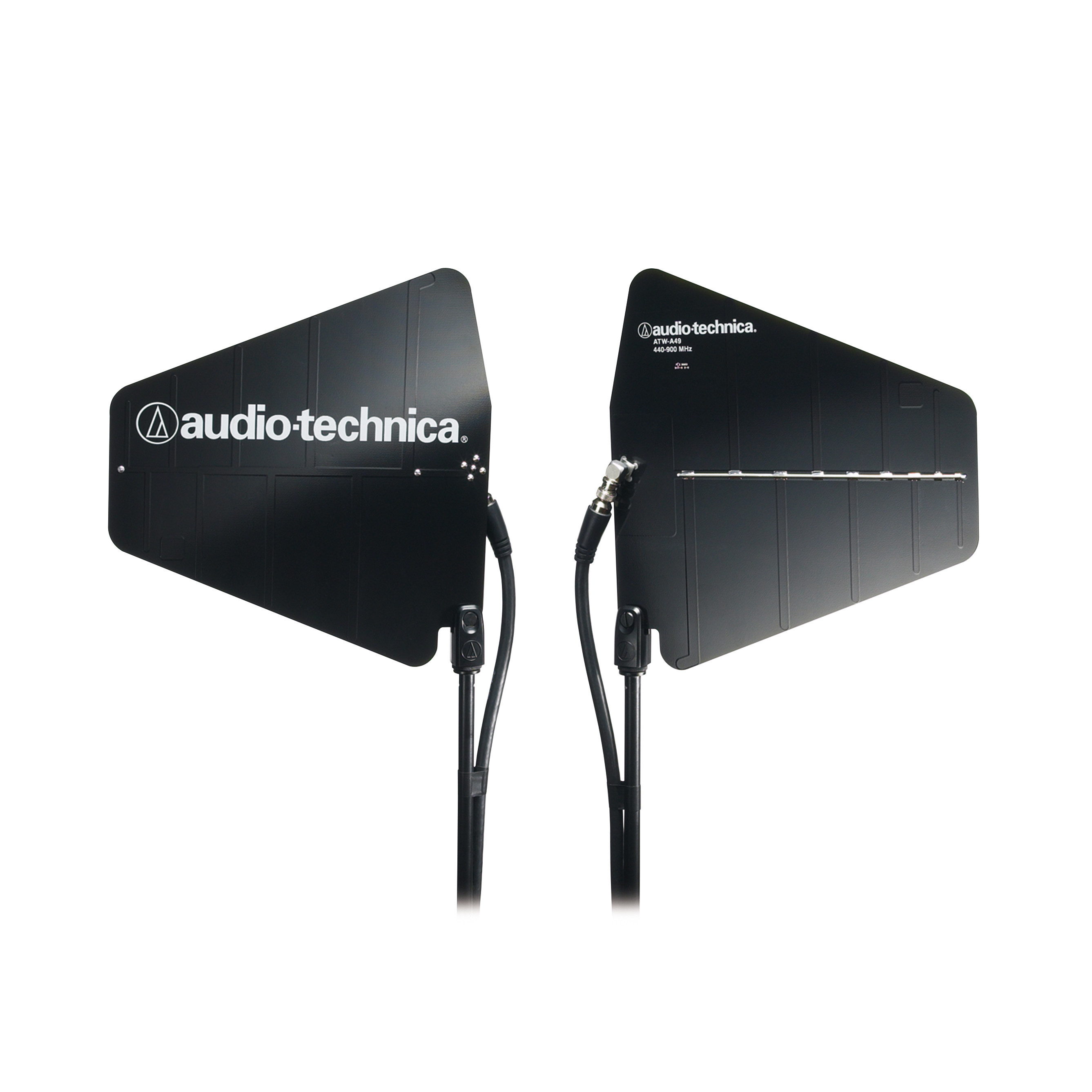 Pair of UHF wide-band directional LPDA (log periodic dipole array) antennas provide enhanced signal pickup for UHF wireless systems throughout a wide band range (440-900 MHz). Each antenna paddle is matched to 50 ohms impedance with an integral high-quality low-loss BNC connector; 6 dB gain. For permanent or temporary installation; mounts to 5/8"-27 threads.