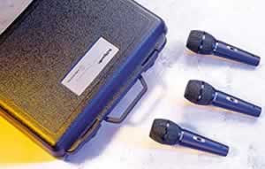 Three custom-engineered cardioid dynamic microphones with stand clamps. Field-proven professional performance. Road-ready all-metal construction. Superior internal shock mounting.