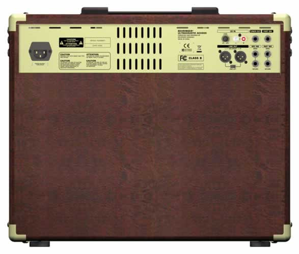 The instrument channel (on the left) features a PHASE switch that reverses the phase, a function that can eliminate the feedback common in acoustic guitar pickups. Both channels feature a TUNER switch that silences the speaker so you can tune your guitar via an external tuning device, which can be connected directly to the amp via the TUNER OUT 1/4" jack on the back panel.