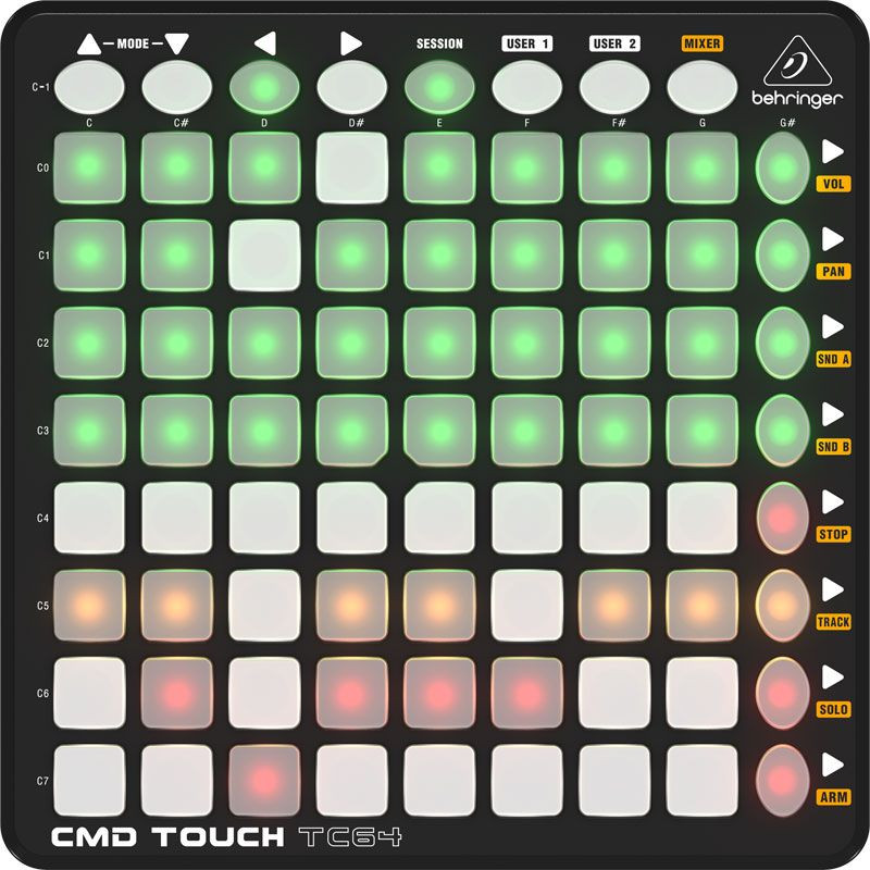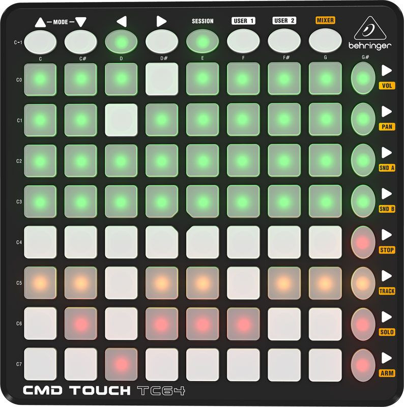 Clip MasterThe TC64 is the ideal clip-triggering and MIDI event controller, with 64 buttons that are brilliantly backlit in multiple colors and respond to MIDI feedback. All the performance buttons are laid out in an 8 x 8 grid and conveniently color-coded, so you always know what going on. Across the top and down the right side, you'll fi nd 16 additional buttons for Mode (TOUCH TC64 and Novation Launchpad S emulation), navigation, Session, User 1 & 2, Mixer, Track control and more.