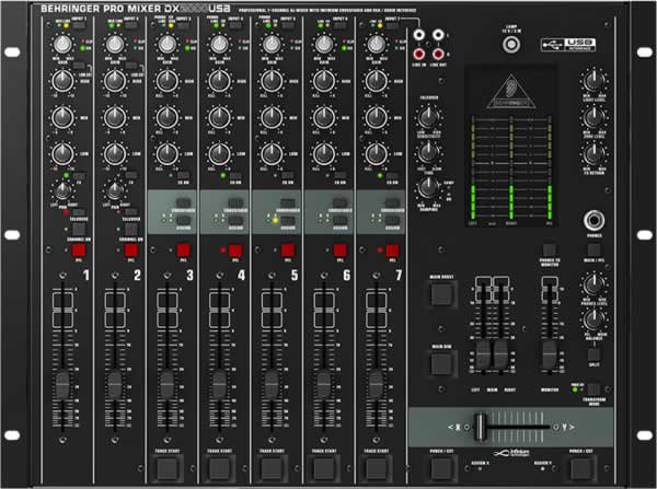 The Behringer DX2000USB is a professional 7-Channel DJ Mixer with infinium "Contact-Free" VCA Crossfader, USB/Audio Interface and Massive Software Bundle