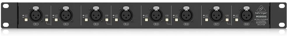 The 1RU MS8000 features 8 XLR Input sockets on the front panel for your mics and DI boxes, along with a LIFT/GND switch to eliminate hum or other noise from ground loops. Each channel features an XLR Direct Out connector, which outputs a post-transformer copy of the input signal, and a second XLR Link Out connector sends a pre-transformer copy of the input signal. This configuration allows sending your Direct Out signals to the FOH or recording console, and the Link signals to your monitor board or phones mixer - making the MS8000 the ideal choice for both your live performances and the studio.