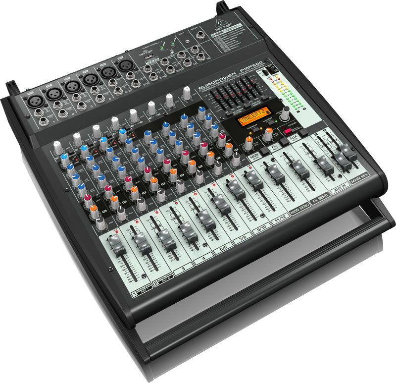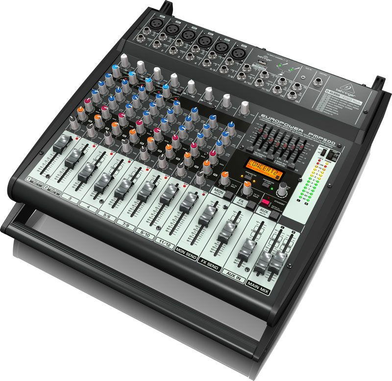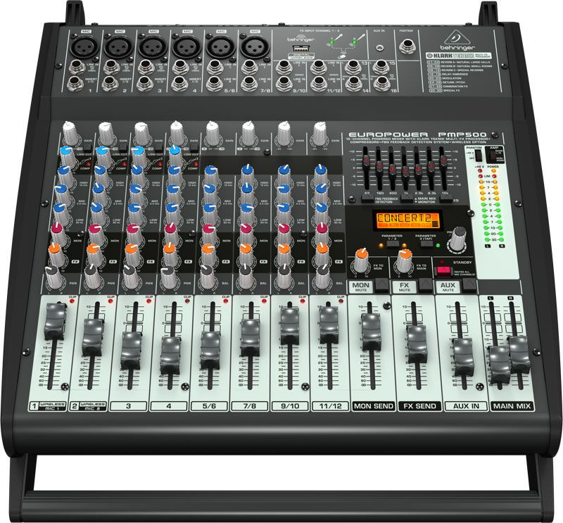 Europower PMP500The amazing PMP500 Powered Mixer packs tremendous power (2 x 250 Watts, selectable as stereo or dual mono), while maintaining an incredible power-to-weight ratio. These mixers employ high-efficiency Class-D technology and a state-of-the-art switch-mode power supply, which significantly reduces weight and heat. The 12-channel PMP500 features 6 high-quality mic preamps (2 of which also accept our ULM Digital Wireless Microphones, available separately), our "one-knob" compressors, 4 stereo channels, plus 2 additional stereo inputs and 1/8" Aux Input for the maximum in versatility. To round out this phenomenal feature set, we added a KLARK TEKNIK 24-bit Multi-FX processor with 32 awesome presets, including studio-class reverbs, delays, pitch shifter and various multi-effects with dual-addressable parameters, Tap function and storable user parameter settings and a 7-band stereo graphic EQ with our proprietary FBQ Feedback Detection System for the ultimate in feedback-free performance.
