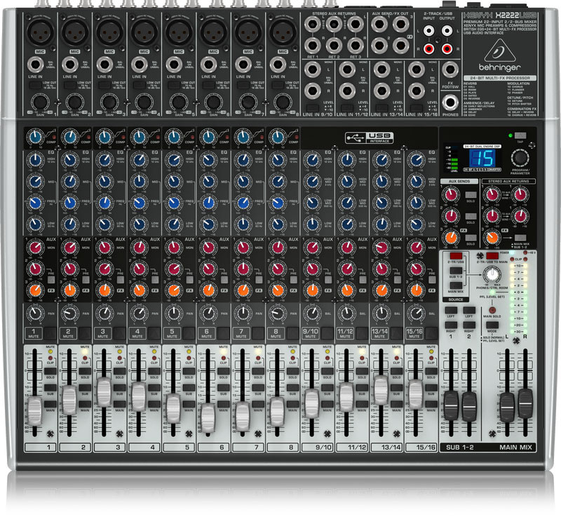 Built-in Digital Multi-FX Processor Equipped with our studio-grade 24-bit Multi-FX processor, the X2222USB gives you 16 mind-blowing digital effect presets such as delay, chorus and reverb. Time-based functions can be entered manually by pressing the Tap button in tempo with the music. Apply them to any channel, as well as to the monitors and main output. Of course, if you have treasured outboard gear you've grown attached to, the X2222USB lets you integrate them into the mix bypassing the built-in FX processor.