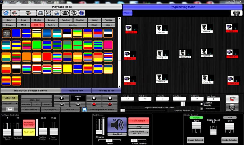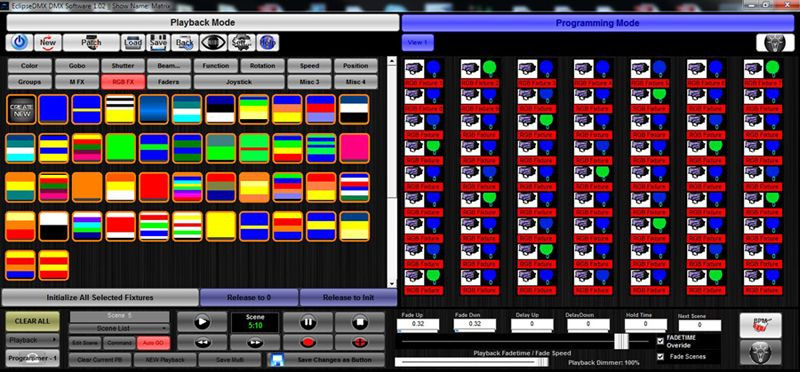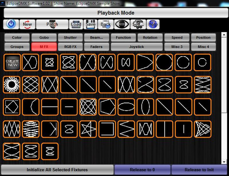 • Over 30 pre-programmed shapes for moving heads or scanners and over 30 pre-programmed RGBAW Color FX pre-programmed into the software for "Ready to Go" effect creation.