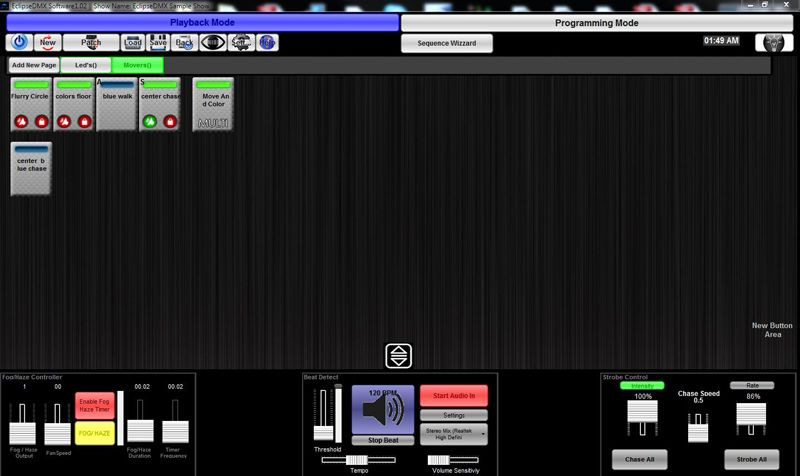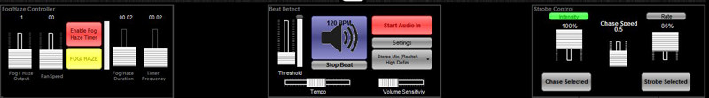 • Global controls for Fog/Haze Machines, Strobes and chaser controls.