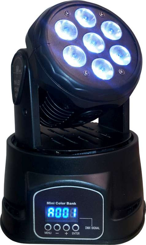 The Flurry' Q mini moving wash provides a truly impressive display of color with it's 7 x 10-Watt TianXin Quad-Color LEDs, yet it fits in the palm of your hand! It is a 7 or 12-channel DMX LED fixture with RGBW color mixing capability. The unit features built-in color macros for a number of popular hues.