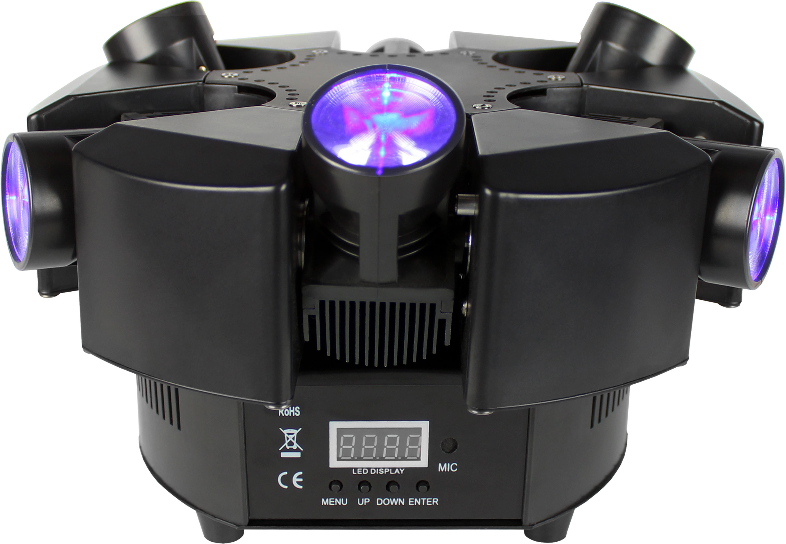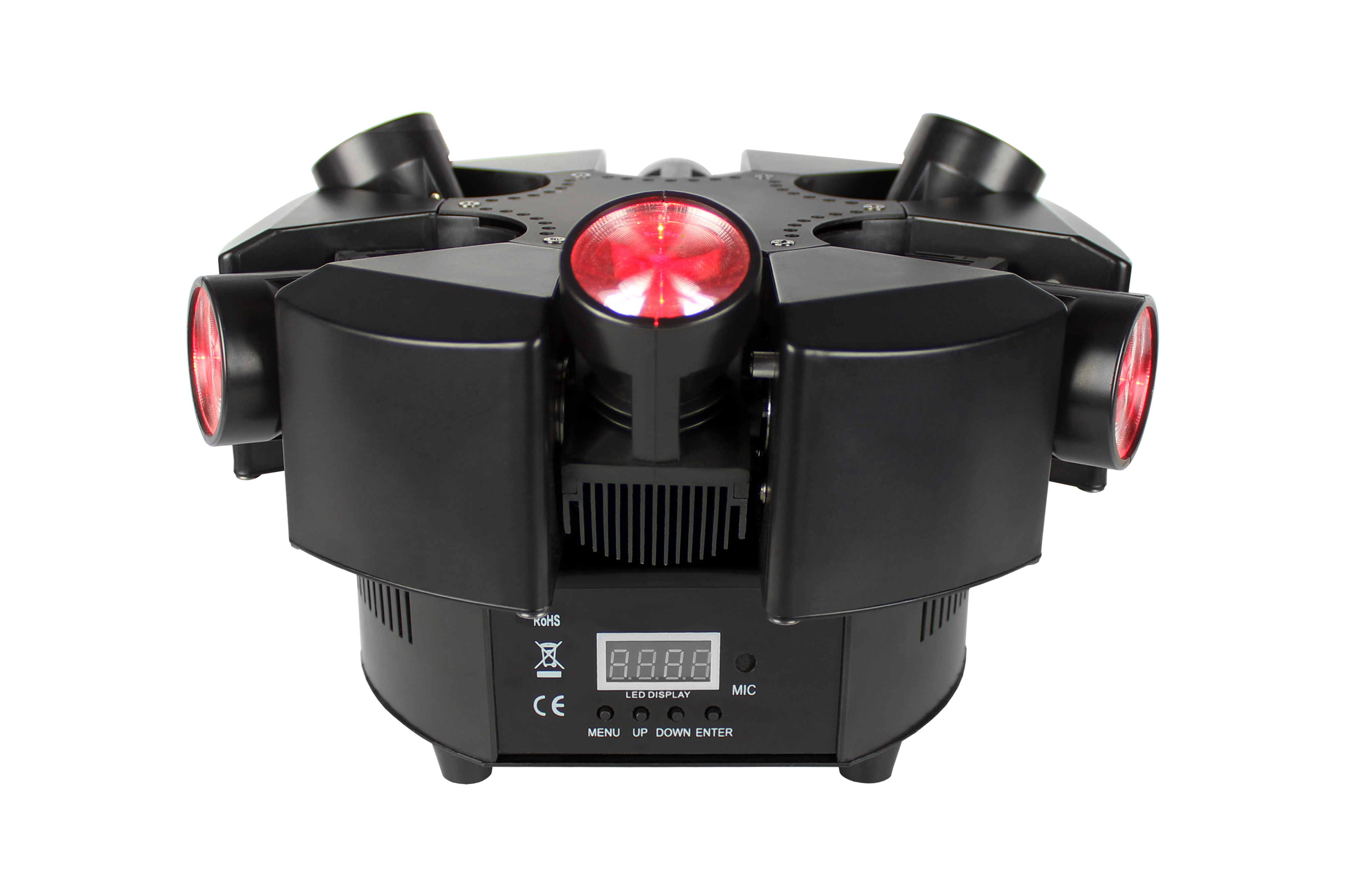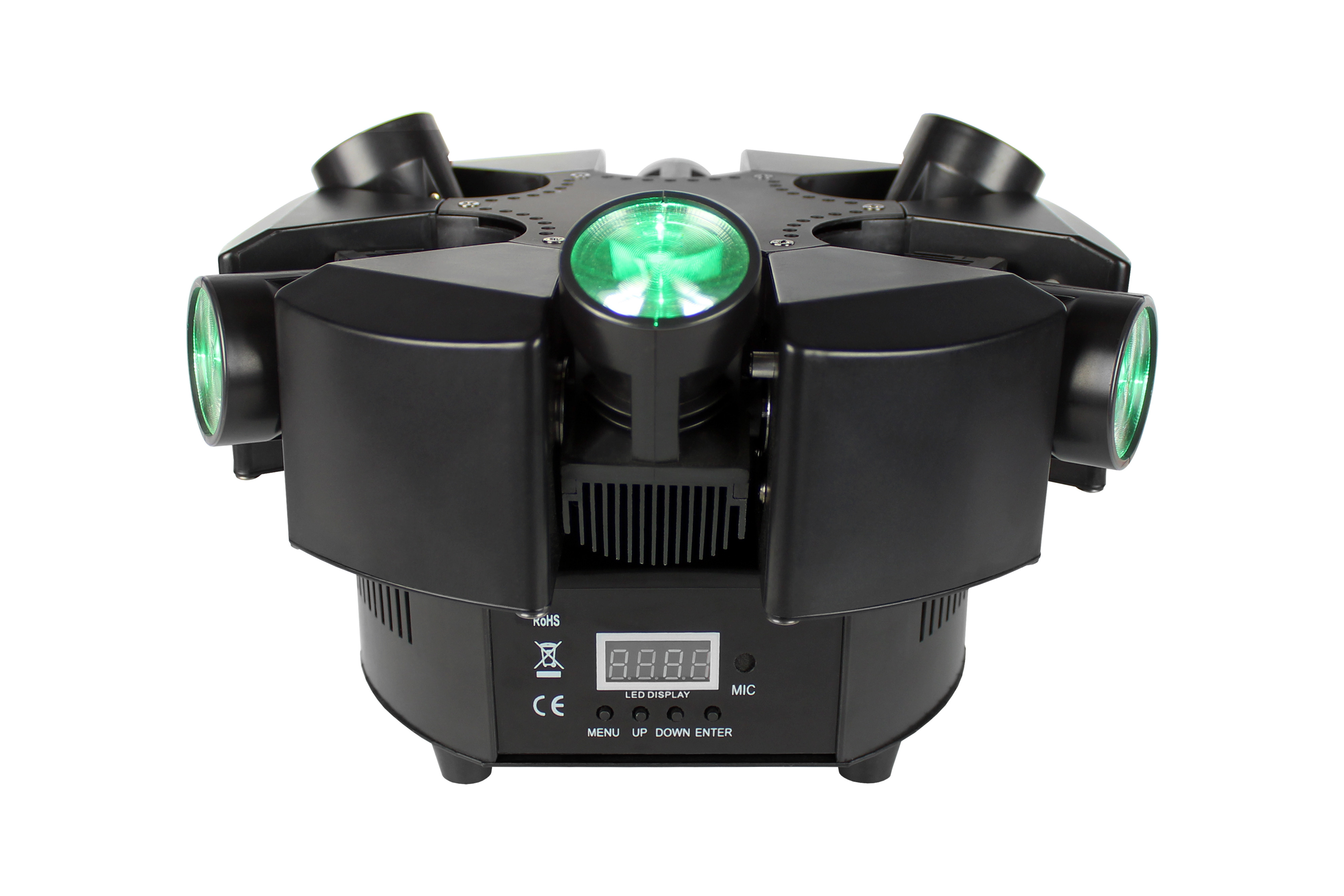Shoqwave' X6 offers 6 mini moving heads that are fitted on a base that's capable of infinite, or 360 rotation. Each individually controllable head has an ultra-bright 10W R/G/B/W LED (no color mixing) for ultra-narrow 5.7 split color beams. Each head also has amazingly fast 120 tilt.
