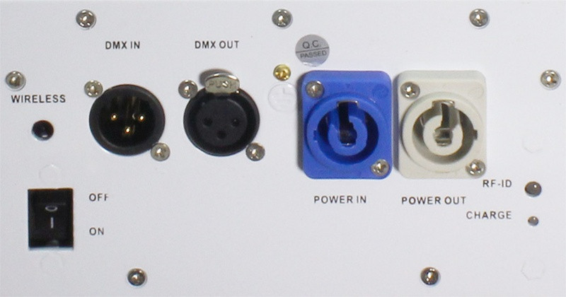 This fixture also features built-in PowerCon' compatible AC power In/Out connectors, 3-pin DMX in/out connections, a main power switch, and an LED illuminated battery power gauge which illuminates red during charge, and green when fully charged. These are all conveniently located on the back side of the fixture.