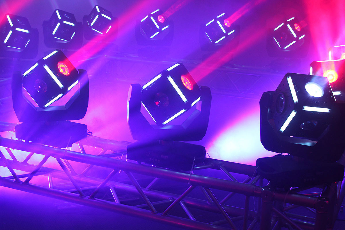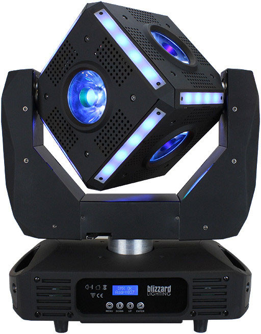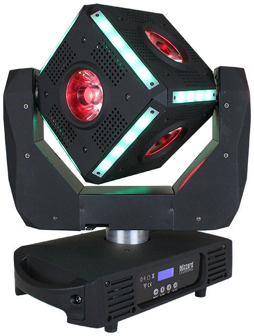 Snake Eyes' are incredible, futuristic cube shaped moving head fixtures fitted with 6* high output OSRAM 60-watt RGBW LEDs (one per side), each with an ultra-sharp 4 beam angle. A bonus of 12* RGB strips beautifully highlight each edge of the head, which can perform color chases in auto mode or be controlled via DMX with a separate dedicated strip chase speed control channel.