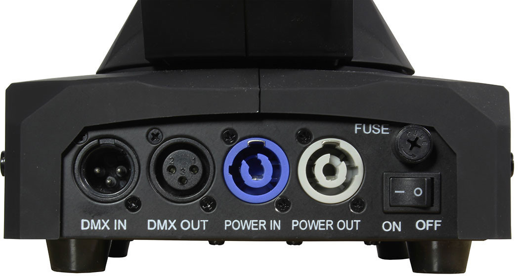 The power input/output connections found on the back side of Stimul-Eye' fixtures are industry standard PowerCON compatible, and DMX 3-pin In/Out jacks + a single quarter-turn "Omega" quick connect type clamp bracket round out the many professional features you'll find in this incredible mini moving head effect fixture!