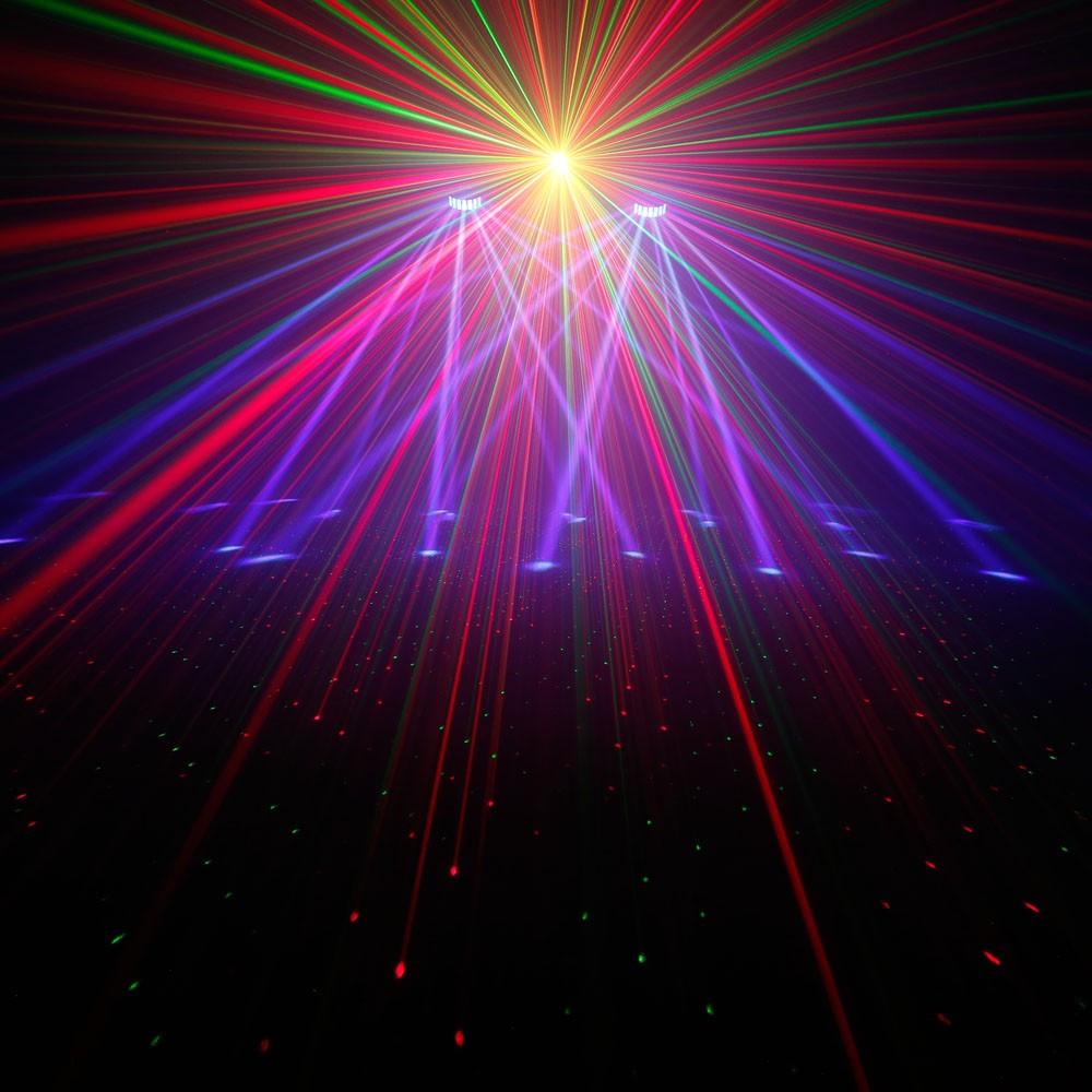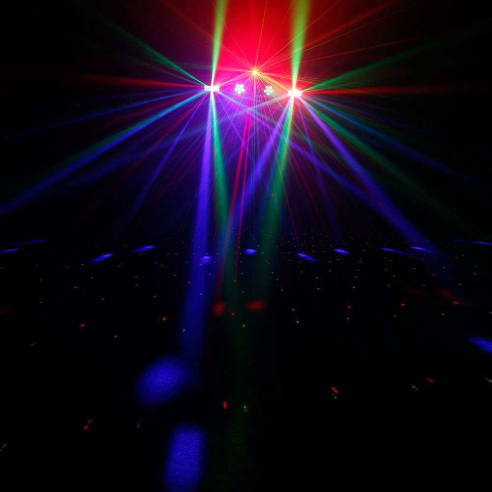 Features• All-in-one lighting system with 5 intense effects including 2 brilliant LED PAR cans, 2 rotating LED derbies, 4 strobe LEDs, a grating laser and UV light