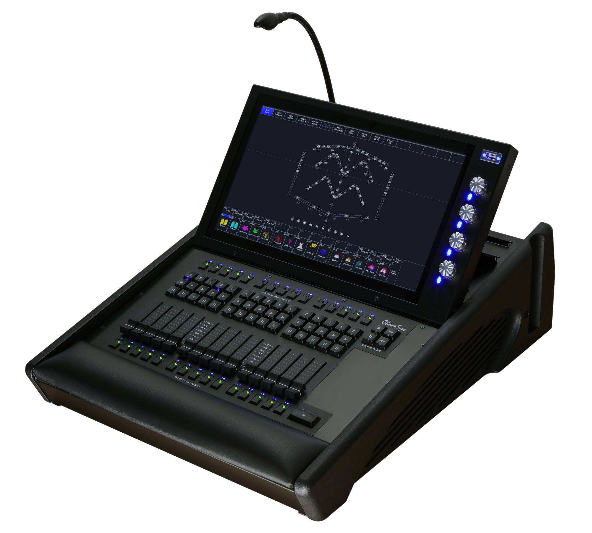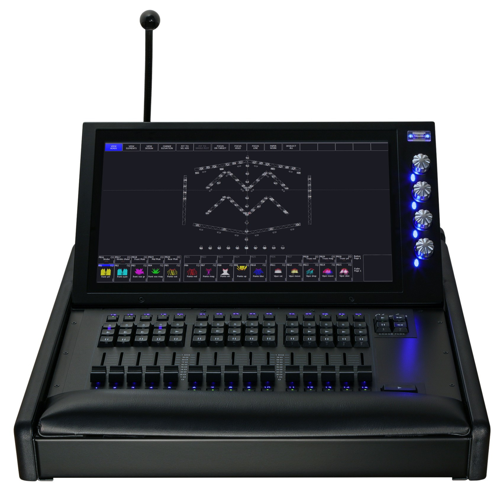 It also has and 4 Encoders which are multi purpose. They can be assigned functions from the Execute and other MagicQ Windows to enhance playback performance.