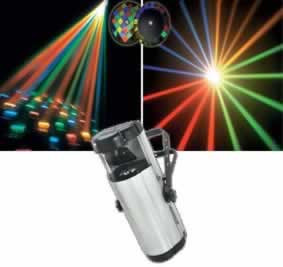 Effect can be switched between Sound Active, Rotating or Static Mode. Mirror swings 180 degrees. Internal dichroic dish is sound-activated. 2 dichroic dishes included: Tunnel and Moonflower.