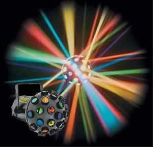 Lightweight, sound-activated with 26 lenses, 52 multicolored beams. Beams cross back and forth.