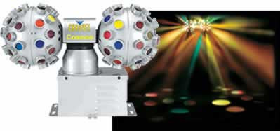 Cosmos 2.0 is a versatile rotating beam effect with two sets of easily interchangeable covers, giving users the flexibility to change the lighting style from a dome to a chopper effect in a heartbeat. It projects a multitude of vertical, horizontal and oblique rays and features 74 interchangeable colored lenses and 24 clear lenses and. Two spheres rotate 3600 around their own axis and around the axis of the base. Controllable features include flash/full on (controlled on-board via a switch), flash speed and rotation speed (controlled via a knob). These functions are also accessible via an optional CON-EF2 wired controller. Cosmos 2.0 is mounted using a single clamp. Its wide light dispersion makes it perfect for both mobile and permanent applications. A total light output of 600 watts by two easily accessed 300-watt halogen lamps position Cosmos 2.0 as an economical and bright centerpiece.
