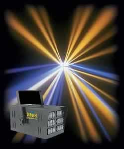 Sound-activated with 36 beams. 8 dichroic colors plus white. Dichroic dish rotates freely. Strobe-like effect.