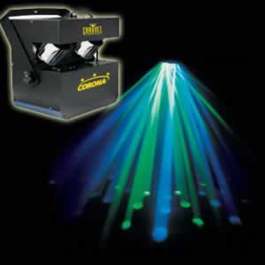 NEW LOWER PRICE! Chauvet's CH-410 Corona is in a category all its own! Features rocking beams that project 6 different dichroic colors onto two independently rotating barrels. Sound activated, PLUS includes several pre-programmed light shows.