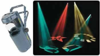 DMX-512, 4-channel DMX scanner. Sound-activated stand alone also. Built-in programs. Pans 180 degrees, tilts 90 degrees. Combined dichroic colors/gobo wheel: 2 multicolored, 1 quadri-colored, 5 colored gobos, plus white.