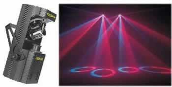 DMX-512, 4-channel DMX scanner. Sound-activated stand alone option. Built-in programs. Barrel rotates 360 degrees, swivels 180 degrees. Combined dichroic colors/gobo wheel: 2 multicolored, 1 quadri-colored, 5 colored gobos, plus white.