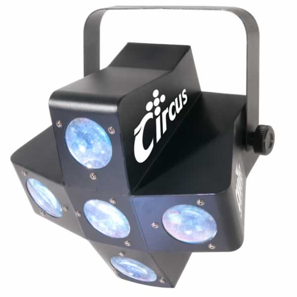 The Chauvet Circus is a dazzling, ever-changing effect light with razor-sharp, flowing beams. Five separate, synchronized pods create amazing effects both in the air and projected onto any surface. The red, green, blue, white and amber LEDs provide a nearly endless combination of colors.