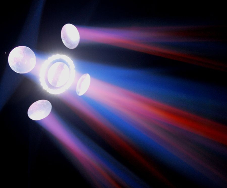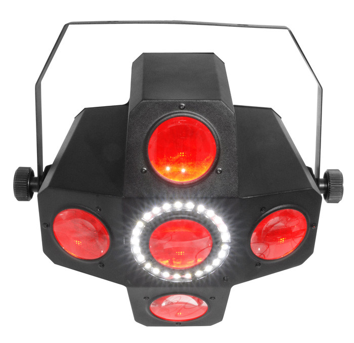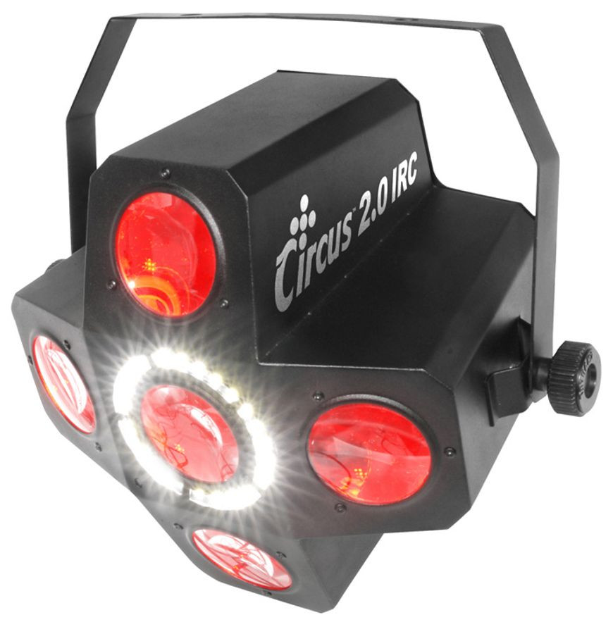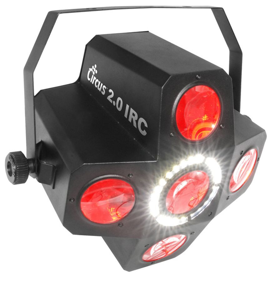 Circus' 2.0 IRC is an ever-changing effect light with flowing, razor-sharp beams and a ring of punchy white LEDs optimized for strobe effects. Five separate, synchronized pods create bold effects both in the air and onto any surface. Red, green, blue, white and amber LEDs provide a multitude of colors to achieve any look. For easy access to the automated programs, use the optional IRC remote to take command of the fixture.
