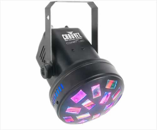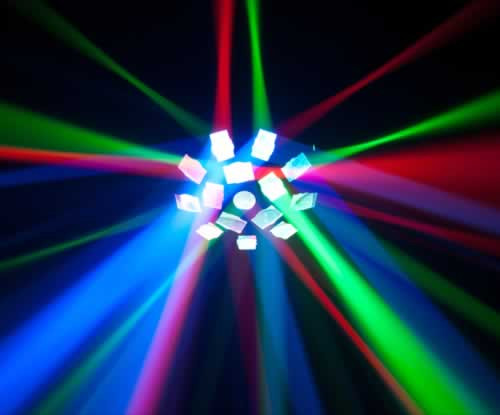 Comet-LED uses red, green, blue and white LEDs to shoot crisp beams of light across the room. This perfect party light has energetic, sound-activated programs that allow beams to dance to the beat without any programming.