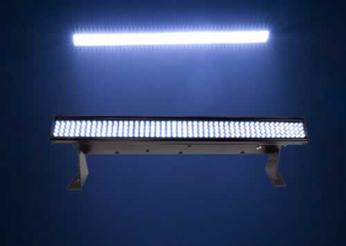 The DIAMONDstrip' Mini is a 19-inch long version of the DIAMONDstrip' wash light, featuring 192 white LEDs controlled by four channels of DMX-512. The light offers blackout, static, dimmer and strobe. Additional features include automated and sound-activated programs via master/slave or DMX. Up to 31 units can be linked via master/slave for a continuous and affordable runway effect.