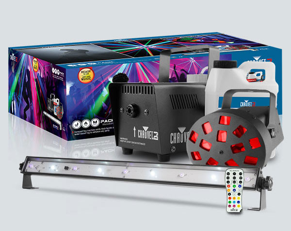The JAM Pack Diamond is a perfect combination of the essential party effects in one convenient package. The pack includes a fog machine, a UV wash strobe combo light and Mushroom. These effects are ready to use right out of the box; just add music! The JAM Pack Diamond's compact fog machine emits thick bursts of water-based fog to enhance any party and the 2-in-1 fixture pairs a UV wash and a white strobe in one amazing effect. The JAM Pack Diamond features easy wireless control of the UV strobe with the included IRC-6 remote and you can also trigger Auto and Sound modes from the IRC-6 remote.
