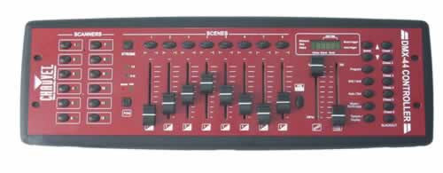 Chauvet's DMX-44 is a universal DMX-512 controller capable of controlling up to 12 intelligent lights with 192 DMX channels of control. 30 Banks of 8 scenes for a total of 240 scenes. It is MIDI compatible and includes fog and strobe control buttons to run yur entire lighting system.