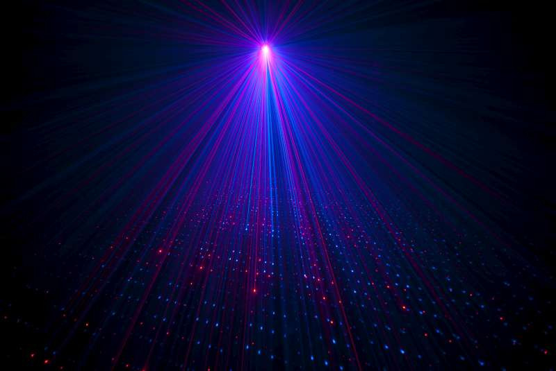 FEATURES: • Compact battery-operated laser projects thousands of red and blue laser beams