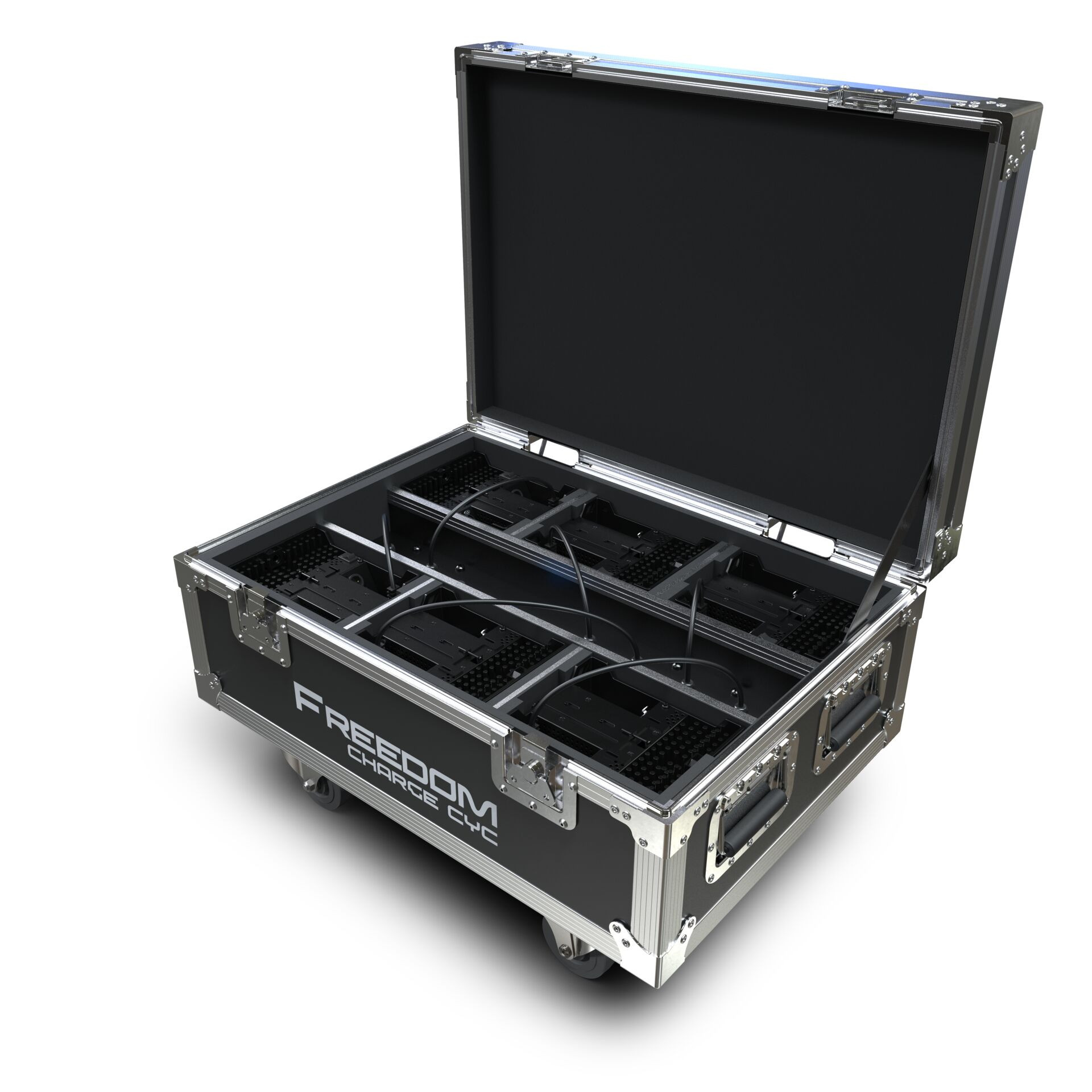 Freedom Charge Cyc is a compact road case that safely transports and charges Freedom Cyc fixtures. The case holds up to 6 Freedom Cyc units using rugged wheels and recessed handles, and its stackable case design allows for faster load-in and load-out times. Freedom Charge Cyc features built-in cable whips to charge fixtures directly, without the need for individual power cords.