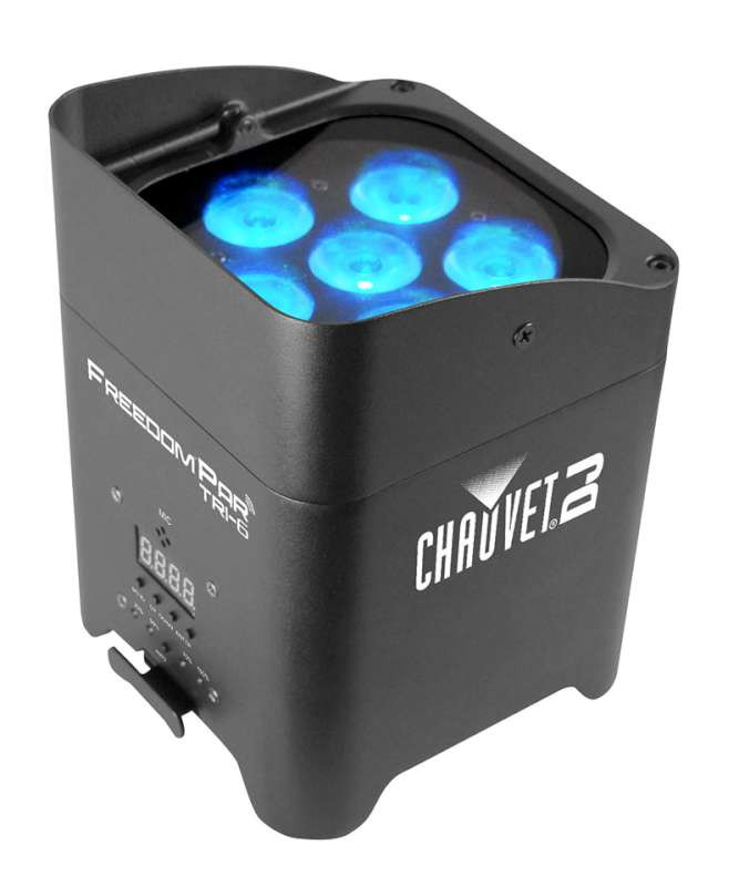 Freedom' Par Tri-6 is powerful, bright, and truly 100% wireless with a rechargeable battery and a built-in D-Fi' transceiver. Freedom' Par Tri-6 has 18 watts of RGB color mixing and can be operated with the control panel, the included CHAUVET DJ IRC-6 remote, or from any mobile phone or tablet running the FlareCON' mobile app. Freedom' Par Tri-6 fits perfectly inside TRUSST and all other 12" box truss, and travels safely and stylishly in the CHAUVET DJ CHS-FR4 VIP Gear Bag.