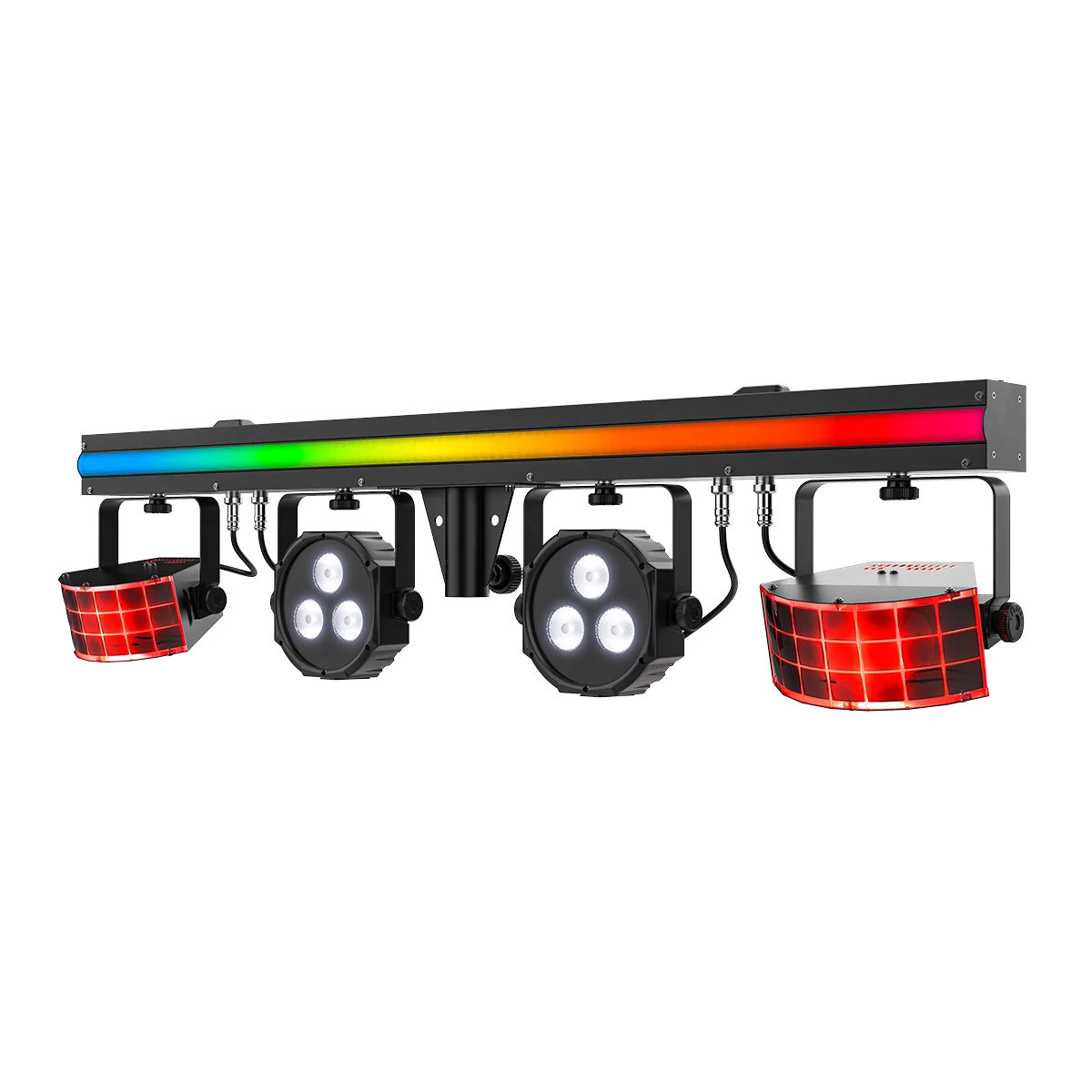 • 3-in-1 light that includes a pair of LED derbies, LED pars, and an LED strip, all mounted on one bar