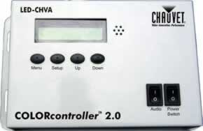 The COLORcontroller' 2.0 is a 4-channel DMX controller designed for use with the COLORtube' 2.0. It features 7 independently selectable preset colors, 13 programmed chases, a speed control channel, flash rate control channel, and selection of preset color combinations. It contains a built-in microphone and LED display for user-friendly operation.