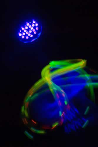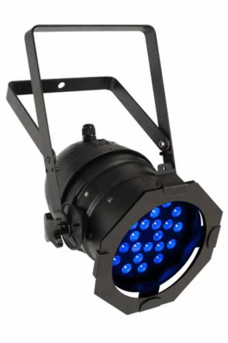 The Chauvet LED PAR 56-24UVB is a black light with 24 1-watt ultraviolet LEDs responding to two channels of DMX control and comes with built-in sound-activated and automated programs. Up to 28 units can be power linked together and it includes a hanging bracket that doubles as a floor stand. It's the ideal LED solution to traditional halogen PAR cans for punchy fluorescents without the heat.