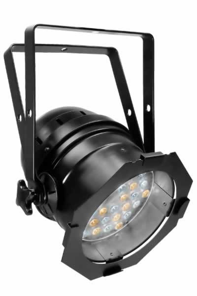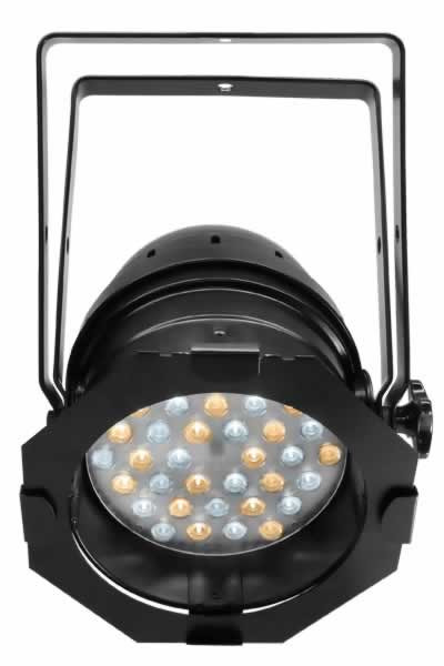 The LED PAR 64-36 VW produces variable shades of white with 18 warm white and 18 cool white LEDs. It offers 2- or 4-channel s of DMX control. Color temperature mixing and custom program recall can be done with or without DMX control. Power link up to eight units at 120V for additional coverage. The hanging bracket doubles as a floor stand for mounting flexibility and it comes in a black casing.
