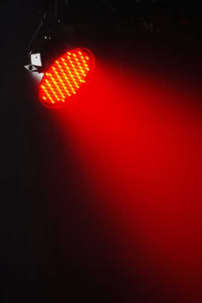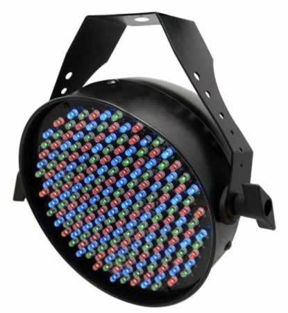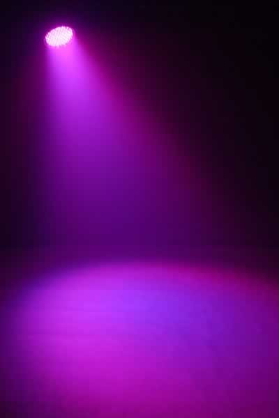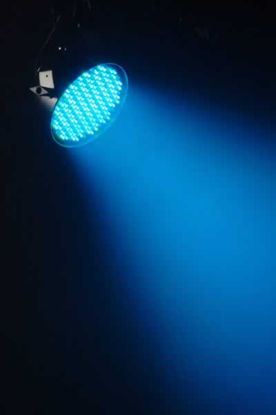 The LEDsplash' 200B is a 6-channel DMX LED wash light that is powered by 199 LEDs. Modes include blackout, static, dimmer, and strobe, with a selector switch mounted on the unit for sound-active or automated programs.