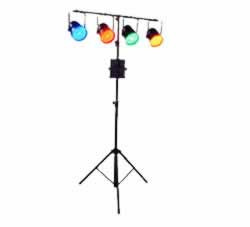 The LED PAR 38 System is a turn-key package designed with bands and DJs in mind. Each package contains 4, LED PAR Cans (in red, green, blue, and yellow), a T-Bar Stand, and a Dimmer Pack with a footswitch to easily control the system.