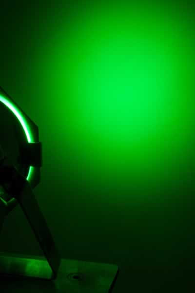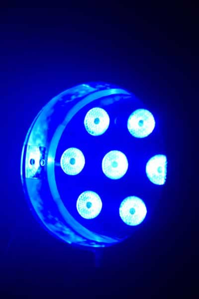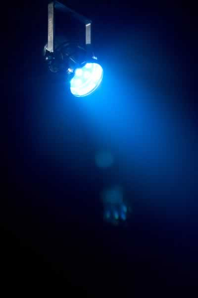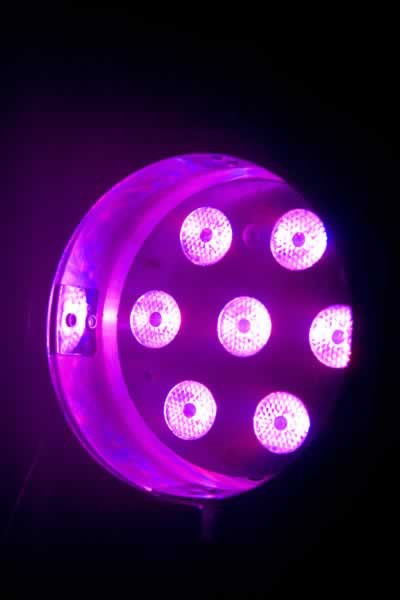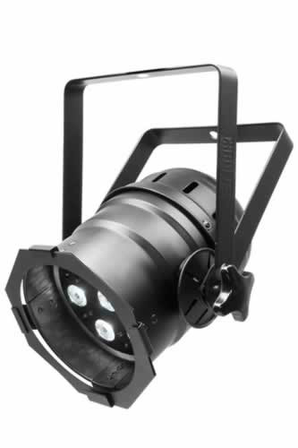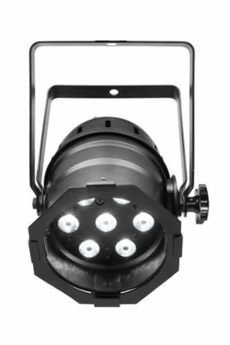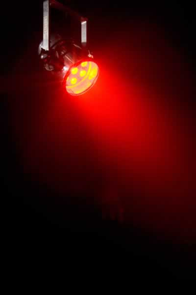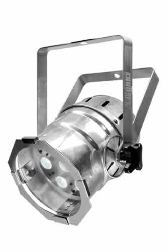 The LED PAR 38 TRI features seven 3W tri-colored LEDs, which allow color mixing in each diode to produce a more vibrant and even color without multi-colored shadows. The unit comes in a black or chrome casing and the hanging bracket doubles as a floor stand.