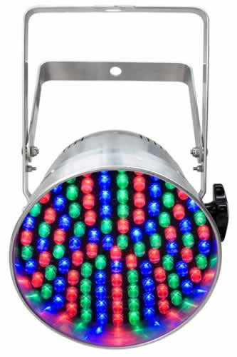 The LEDrain' 56C is a 3 or 7 channel DMX LED narrow beam fixture that features static, dimmer and strobe functions. The unit can switch between sound-active and automatic modes, with static colors and color mixing from 108 red, green and blue LEDs with or without DMX control.