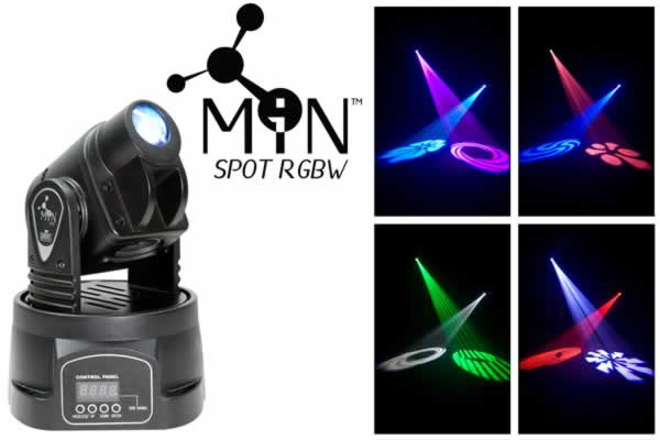 Imagine an LED-fitted moving yoke that can fit in the palm of your hand. MiN' Spot RGBW has a powerful 13-watt quad-color LED and 6- or 14-channels of DMX control with full RGBW color mixing and a gobo wheel with nine gobos. The MINSPOTRGBW has built-in sound activated and automatic programs and vector speed channel for smooth pan and tilt.